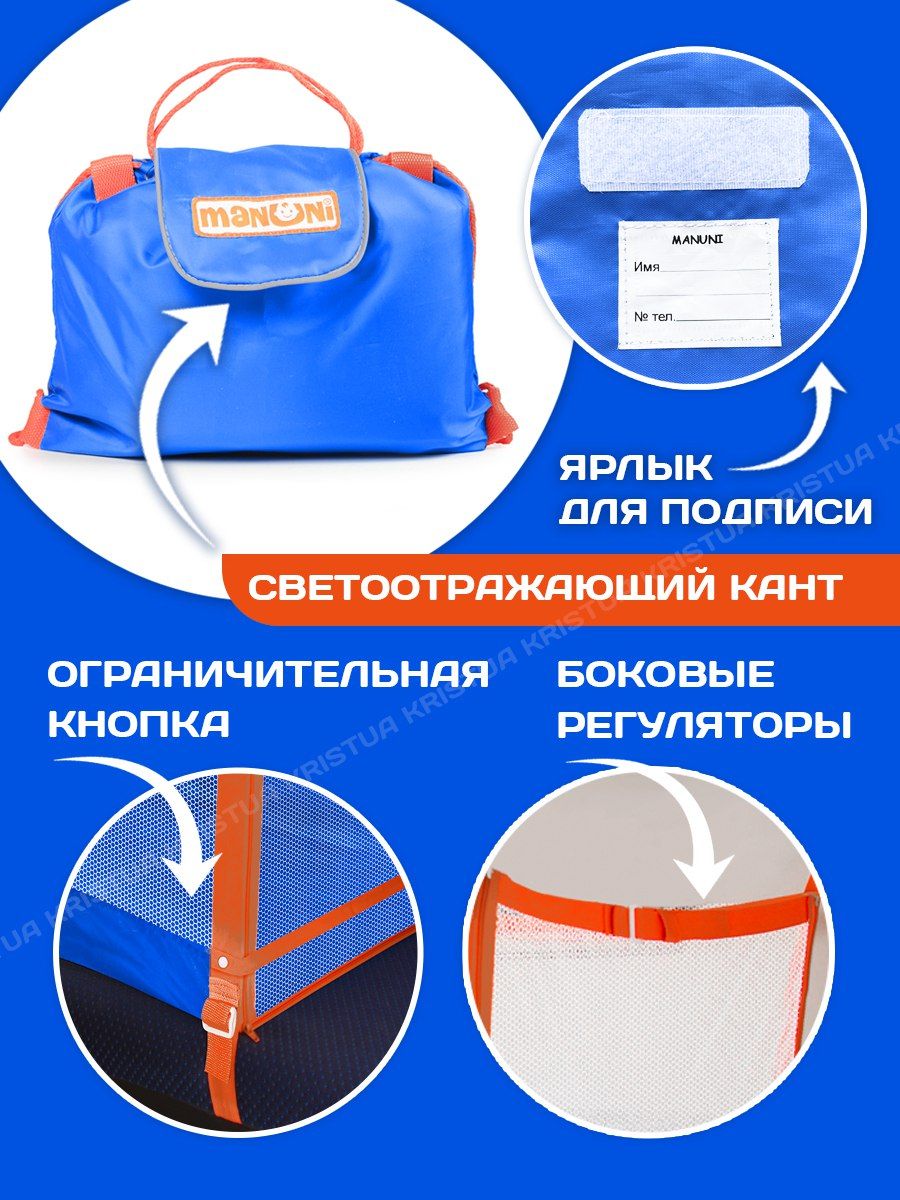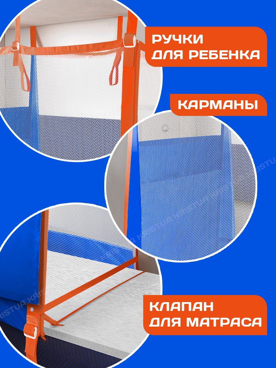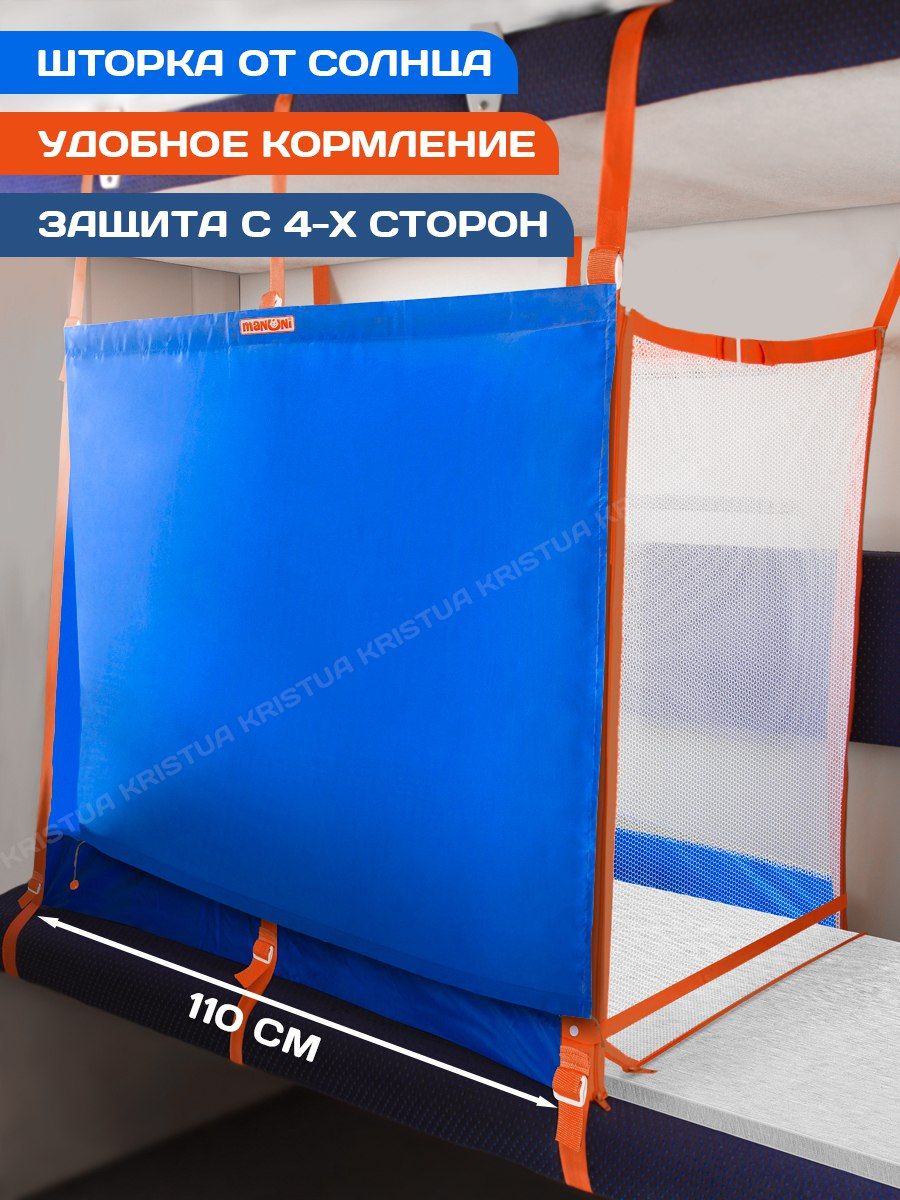 Манеж закрыт с 4 сторон, молнии на боковой стороне (слева и справа) расстегиваются снизу вверх, что, облокотившись сверху ребенок, не смог расстегнуть молнию. Внизу боковой стенки есть клапан на молнии для размещения матраса. При необходимости стенку можно отстегнуть. Приспособление гигиенично, защищает от сквозняков. Обеспечивает комфортный сон родителя и ребенка на нижней полке, создает скрытую зону для кормления грудных детей, позволяет разместить 2 детей на одной полке, родителям свободно передвигаться по вагону. Шторка защищает от солнца и постороннего внимания, крепится с помощью 3 петелек и фиксируется с 2 сторон благодаря пуговицам на резинке. Манеж крепится стропами между верхней и нижней полками в поездах, в том числе на боковых. На боковой стенке - 2 кармана для мелочей. Легко складывается, помещается в небольшую непромокаемую сумку-рюкзачок со свето отражающей лентой. Также есть этикетка для подписи имени и контактов владельца манежа.