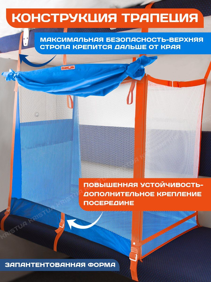 Усовершенствованный Манеж для поезда и 2-ярусной кровати «ТРАПЕЦИЯ» (0+) — это нами разработанная уникальное запатентованное приспособление, которое позволяет безопасно и комфортно путешествовать родителям с детьми от 0 лет и старше в пассажирских вагонах поезда (и на пароме), также можно использовать для дома. Конструкция выполнена в виде трапеции, что обеспечивает большую устойчивость изделию. Манеж сертифицирован и одобрен РЖД.