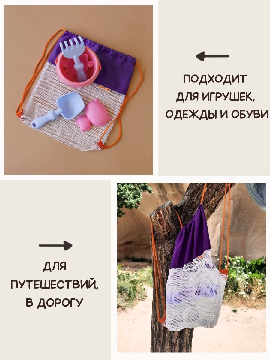 Вы поехали в отпуск к морю? Возьмите мешочек с собой, сквозь сетку удаляется мелкий мусор и песок, оставляя игрушки и вещи после моря чистыми и сухими.Собрав игрушки в мешочек, удобно промывать от песка вместе с мешком. Мешок можно использовать в виде рюкзачка, и ребенок сам сможет его нести. Удобен для игры в песочнице, на даче, а также просто как проветриваемый мешок для длительного хранения игрушек и различных мелочей.